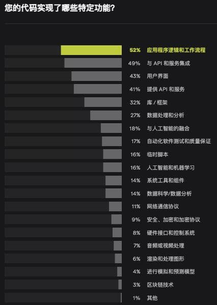 不过,写代码终究是程序员的核心工作,65% 的受访者称他们会将一半的工作时间花在编码任务上,但是也有不少“非编程”工作会占用他们大量的时间。