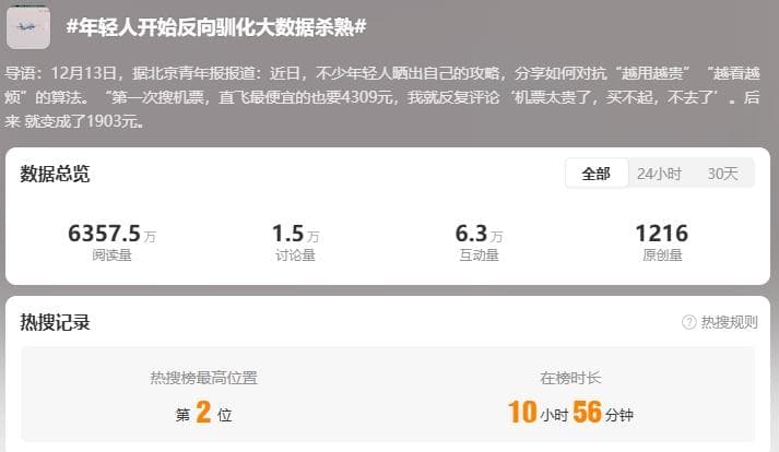 12月15日,话题“年轻人开始反向驯化大数据杀熟”登上微博热搜榜;截止到12月16日,该内容阅读量已高达6357.5万,引发了网友们的激烈讨论。