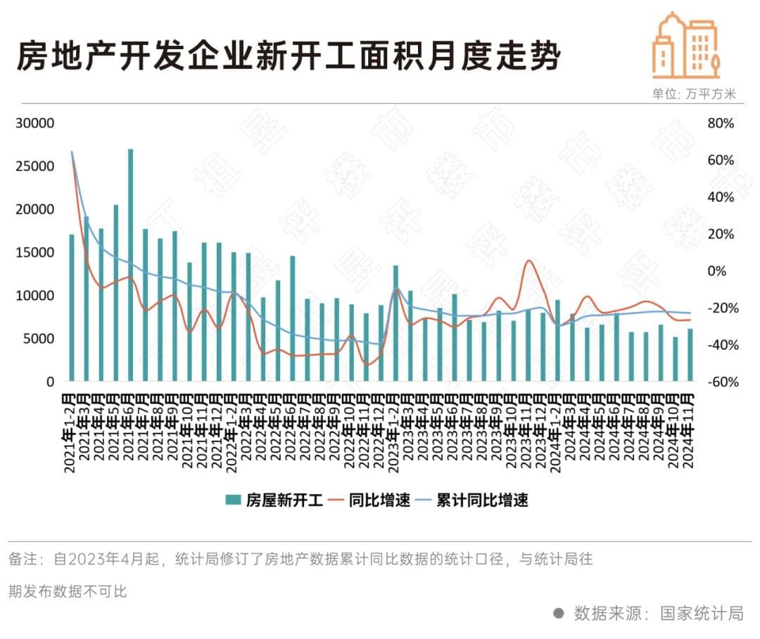 1—11月份,房地产开发企业房屋施工面积726014万平方米,同比下降12.7%。其中,住宅施工面积508389万平方米,下降13.1%。房屋新开工面积67308万平方米,下降23.0%。其中,住宅新开工面积48989万平方米,下降23.1%。房屋竣工面积48152万平方米,下降26.2%。其中,住宅竣工面积35197万平方米,下降26.0%。
