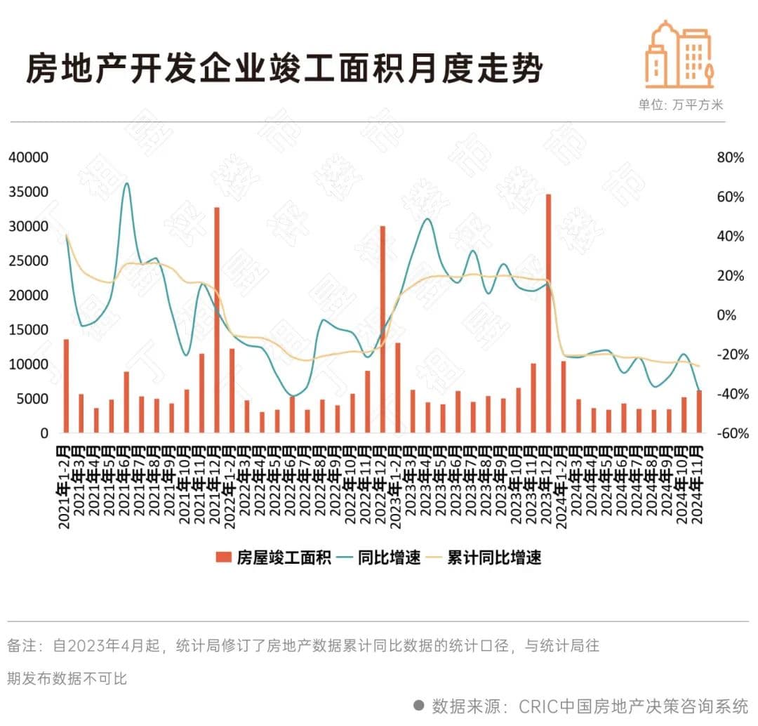 对比年内走势来看,得益于行业资金面的转好,保交楼、保交房等工作的持续推进,11月竣工规模持续环比上升。不过同比来看,受前期销售规模下降、以及行业施工规模收缩影响,竣工面积仍在持续回落。