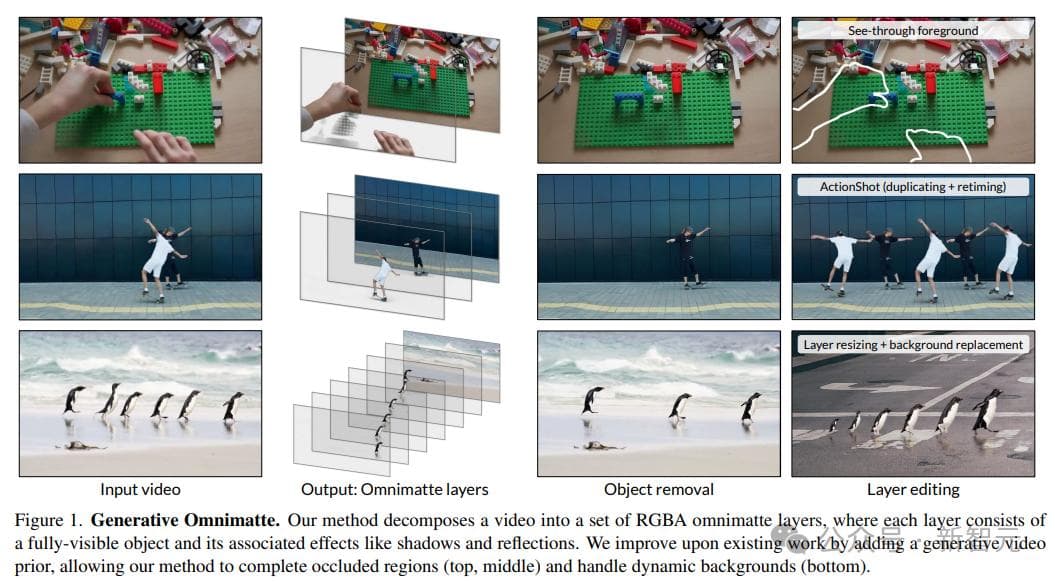 最近,Google DeepMind、马里兰大学帕克分校和魏茨曼科学研究所的研究人员共同提出了一个全新的分层视频分解框架,无需假设背景是静态的,也不需要相机姿态或深度信息,就能生成清晰、完整的图像层,甚至还能对被遮挡动态区域进行补全。