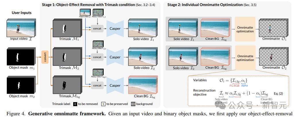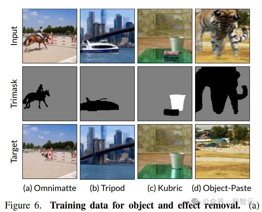 研究人员提出了三元掩码(Trimask)条件M,区分出需要移除的对象(M=0)、需要保留的对象(M=1)以及可能包含需要移除或保留效果的背景区域(M=0.5)。