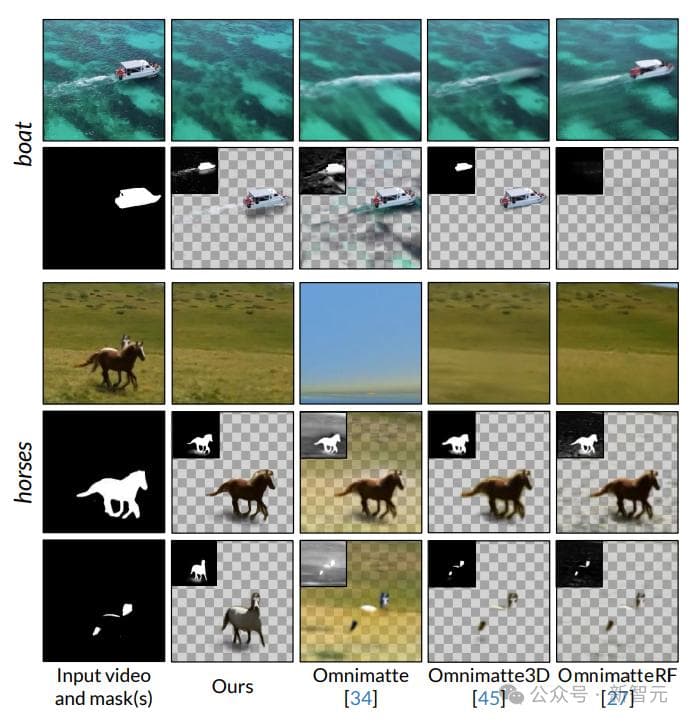 在下图「船」(boat)的例子中,现有的方法无法将船的尾迹从背景层中分离出来,而文中提出的方法可以正确地将其放置在船的层中。
