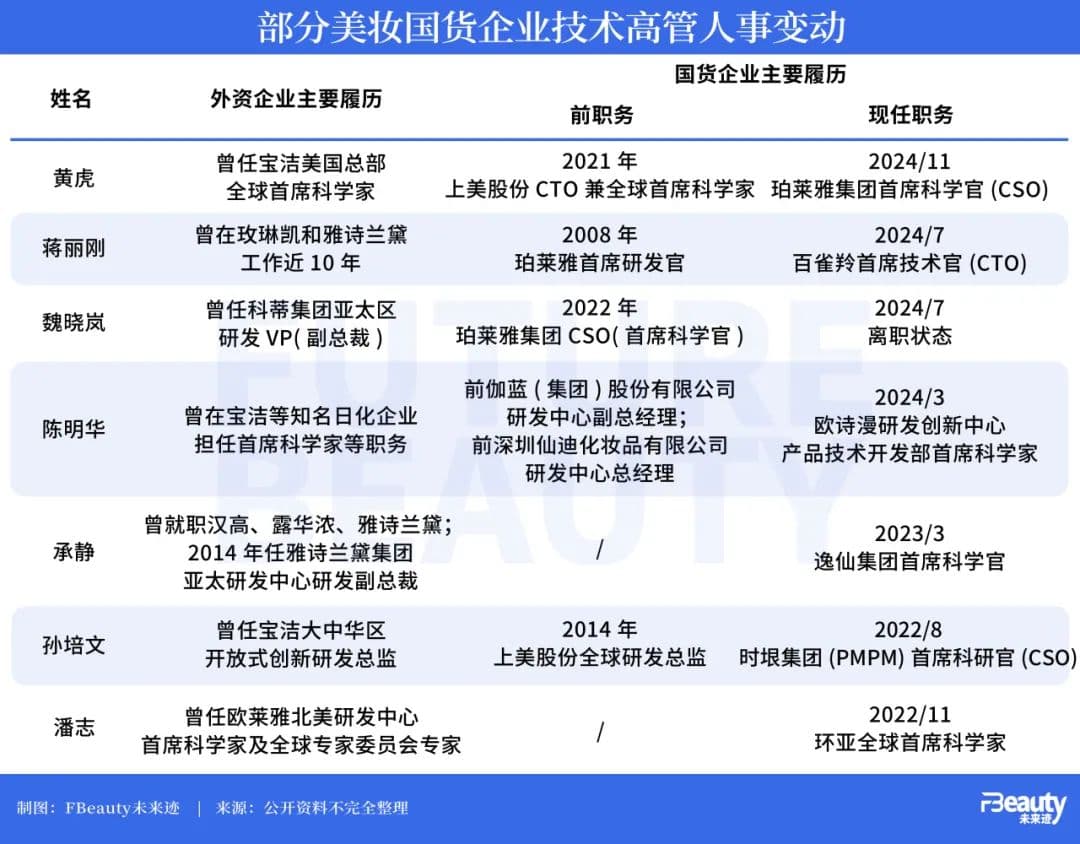 今年头部国货企业之间CTO的“互跳”,引发了业内高度关注:珀莱雅集团首席科学官魏晓岚离职;前珀莱雅首席研发官蒋丽刚入职百雀羚;不久后,前上美股份CTO兼全球首席科学家黄虎又被确认加入珀莱雅。