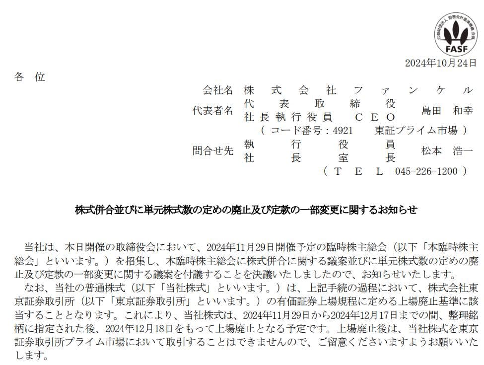 12月17日,是芳珂集团在东京证券交易所上市的最后一个交易日,北京时间14:30,东京证券交易所休市后,芳珂集团发布《关于本公司股票终止上市的公告》宣布将于2024年12月18日在东京证券交易所一级市场停止上市。