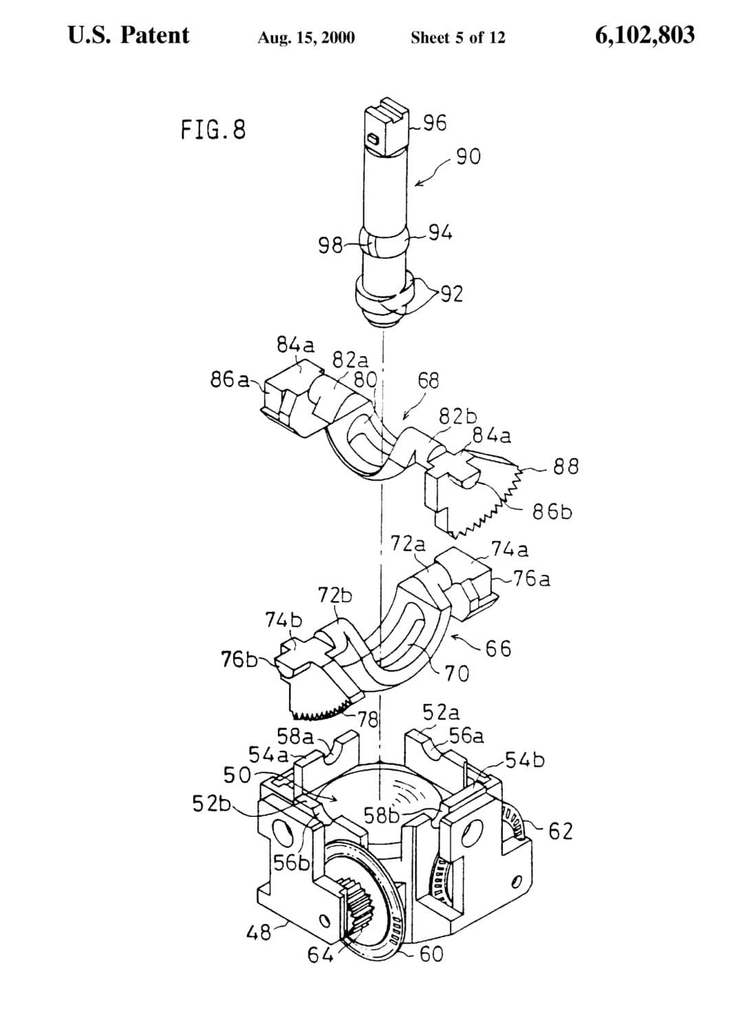 根据任天堂申请的US6102803,N64控制器所带的操纵杆的关键部件包括一个可360度倾斜的杆体和引导环。杆体通过球形连接件固定在设备中,其顶部带有一个符合人体工程学设计的操作旋钮。引导环的八角形设计不仅为操纵杆提供方向引导(如北、东北等),还起到限制倾斜幅度的作用,防止损坏杆体。