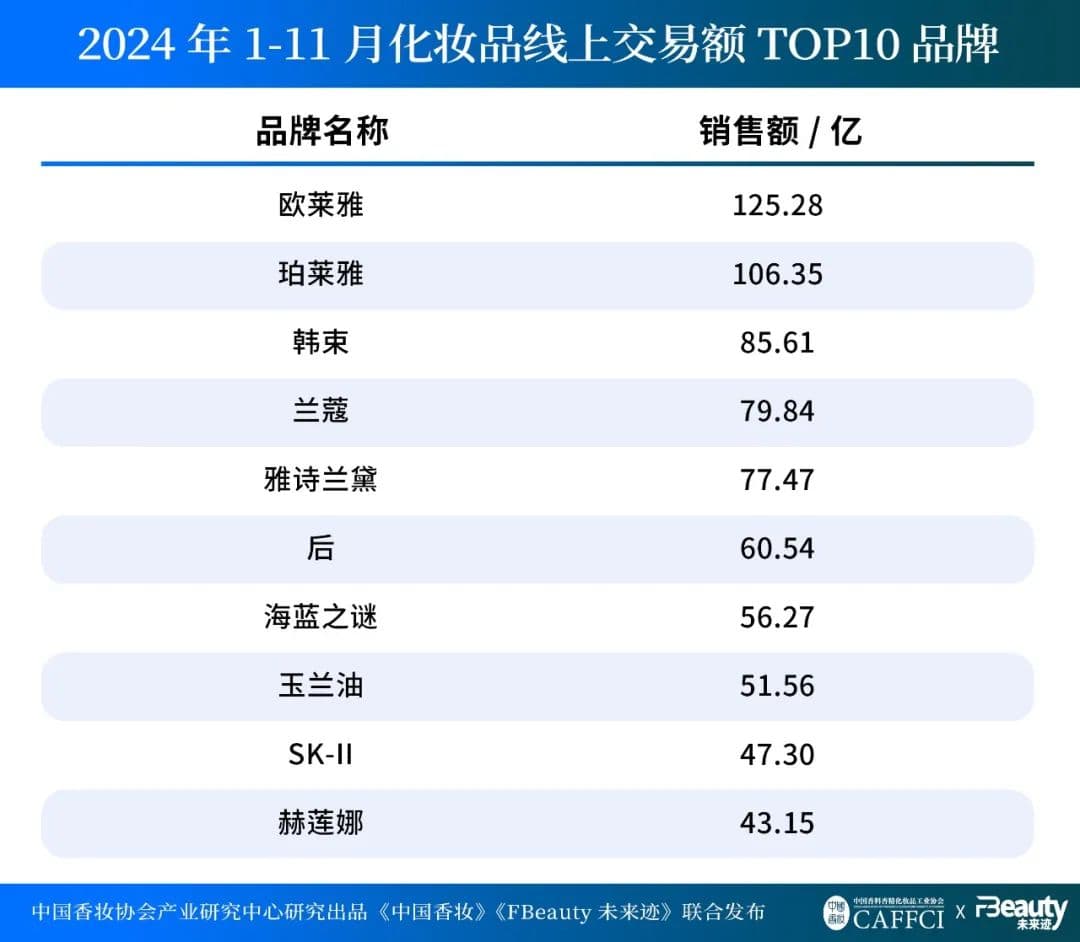 可以发现,品牌之间的销售额差距并不大,例如第4名的兰蔻与第5名的雅诗兰黛之间仅差了2.4亿元,在今年的最后一个月结束之前,品牌座次还将发生变化。