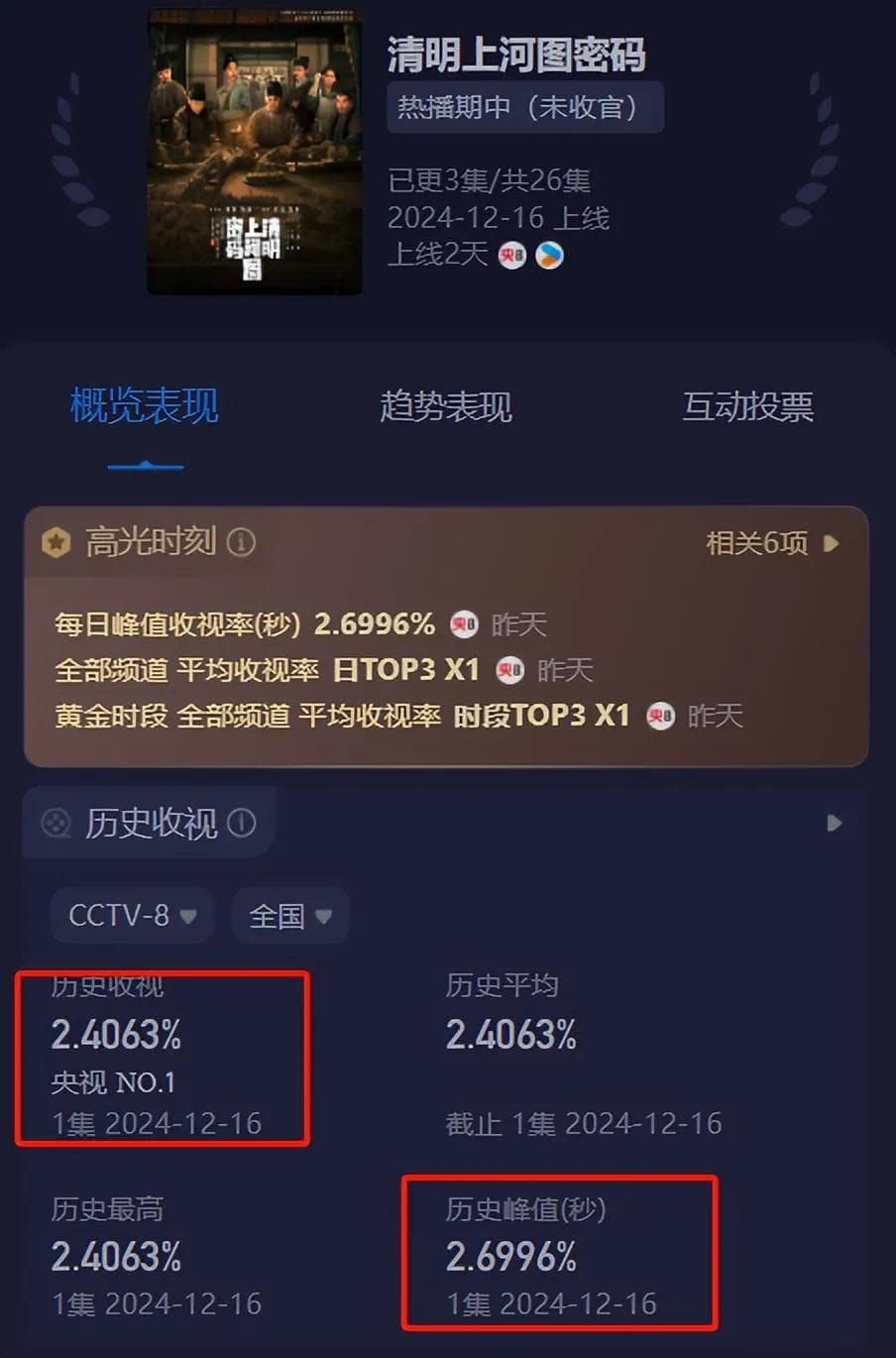 这是新剧《清明上河图密码》第2集开头剧情,以张择端《清明上河图》为蓝本创作的悬疑探案故事,既有北宋人文风貌,又有惊险离奇的悬疑戏码,上线12小时剧集热度便破7000,卫视收视率破纪录达到2.6。