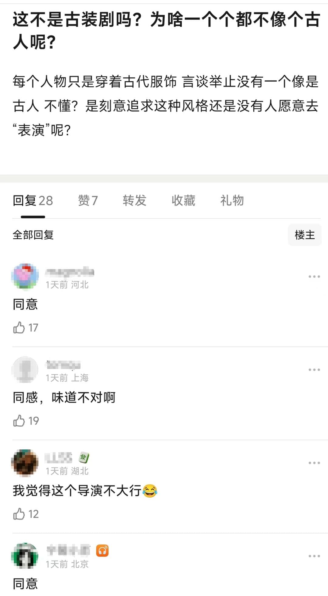 对这部剧的主要差评也集中在此,有观众吐槽道,“每个人物只是穿着古代服饰,言谈举止没有一个像是古人,不知是刻意追求现代感,还是说没有人愿意去表演,让人很难入戏。”