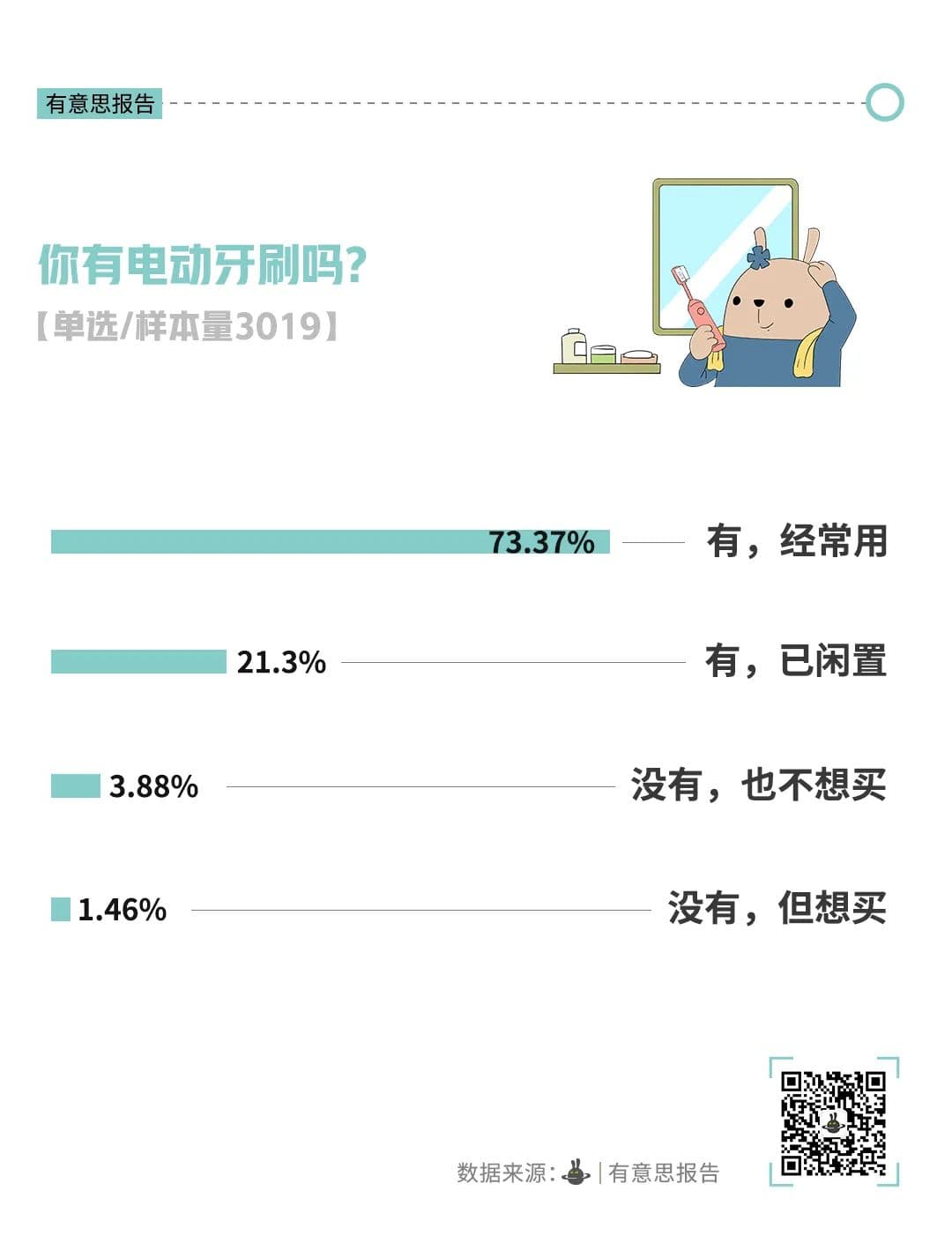 据有意思调查,超过九成受访者拥有电动牙刷,真正对电动牙刷完全不感兴趣的人群比例仅有不到4%。