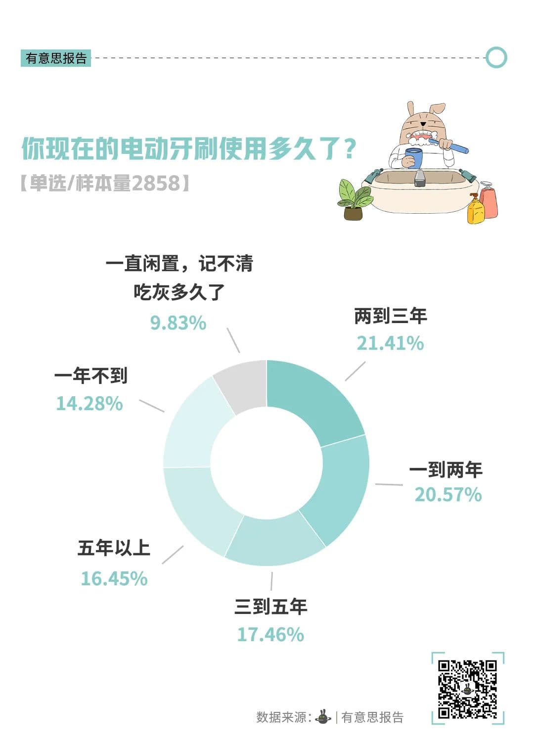 有意思调查显示,超过五成受访者的电动牙刷使用时长都在两年以上,甚至有16.45%的受访者已经使用同一把电动牙刷超过五年之久。