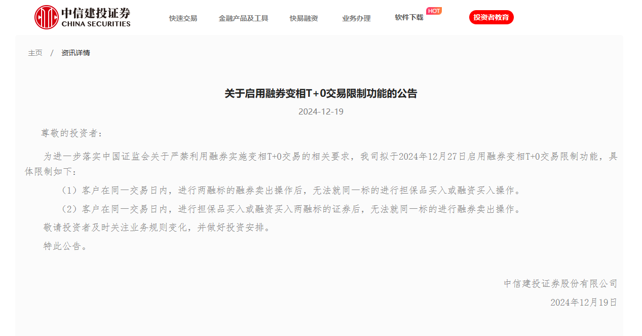 12月19日,中信建投发布公告,为进一步落实证监会关于严禁利用融券实施变相T+0交易的相关要求,公司拟于12月27日启用融券变相T+0交易限制功能,一是客户在同一交易日内,进行两融标的融券卖出操作后,无法就同一标的进行担保品买入或融资买入操作;二是客户在同一交易日内,进行担保品买入或融资买入两融标的证券后,无法就同一标的进行融券卖出操作。