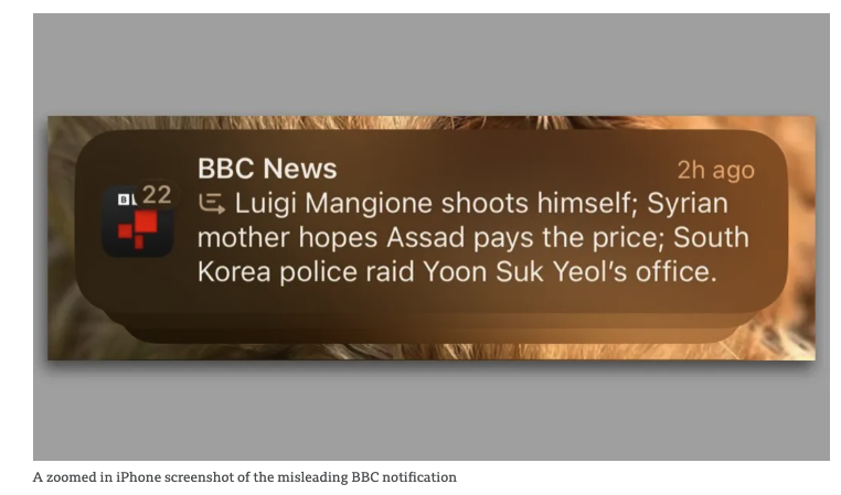 截图显示,苹果的AI推送摘要错误地表示,近期因为枪杀联合健康保险公司CEO引发全球关注的路易吉·曼乔内“对自己开枪”——事实上并没有这回事。令媒体机构难以忍受的是,苹果AI在推送错误总结时,看上去还像是BBC新闻终端推送的信息。