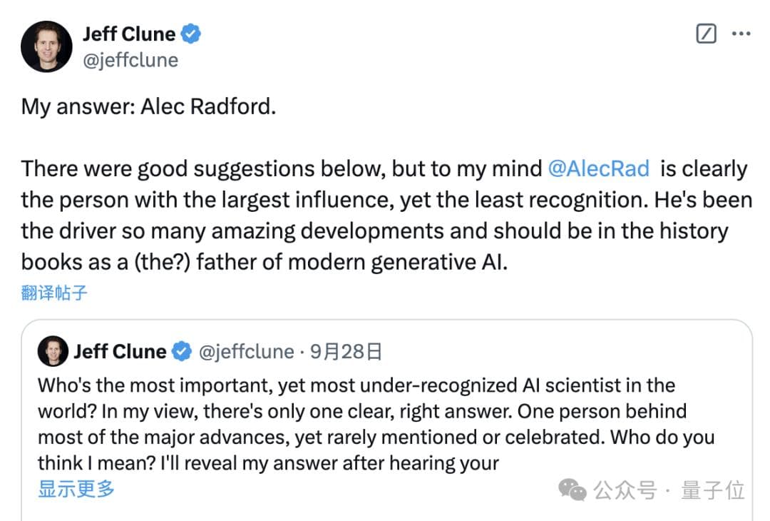 之前,前任研究团队负责人Jeff Clune(已于2022年离开OpenAI,现在是不列颠哥伦比亚大学副教授,同时给DeepMind担任顾问)还对Alec给予过很高的评价,认为Alec是影响力最大但知名度最低的AI科学家之一。