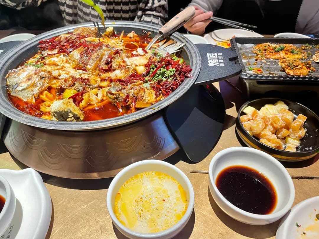 其中,最期待的烤鱼又辣又咸,加了几次汤也没缓解,服务员甚至直接建议倒一碗水涮着吃;包浆豆腐料很足,也有点咸,适合搭配米饭食用;相比之下,她们一致觉得小吃菠萝小油条和芝士烤红薯更符合口味,都是偏甜口的,适合解辣解腻。