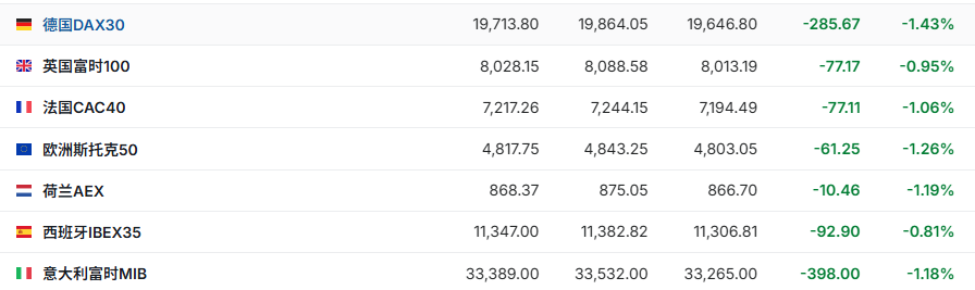 正在交易的欧洲股市多数走低,德国DAX30指数现跌1.43%,英国富时100指数跌0.95%,法国CAC40指数跌1.06%。