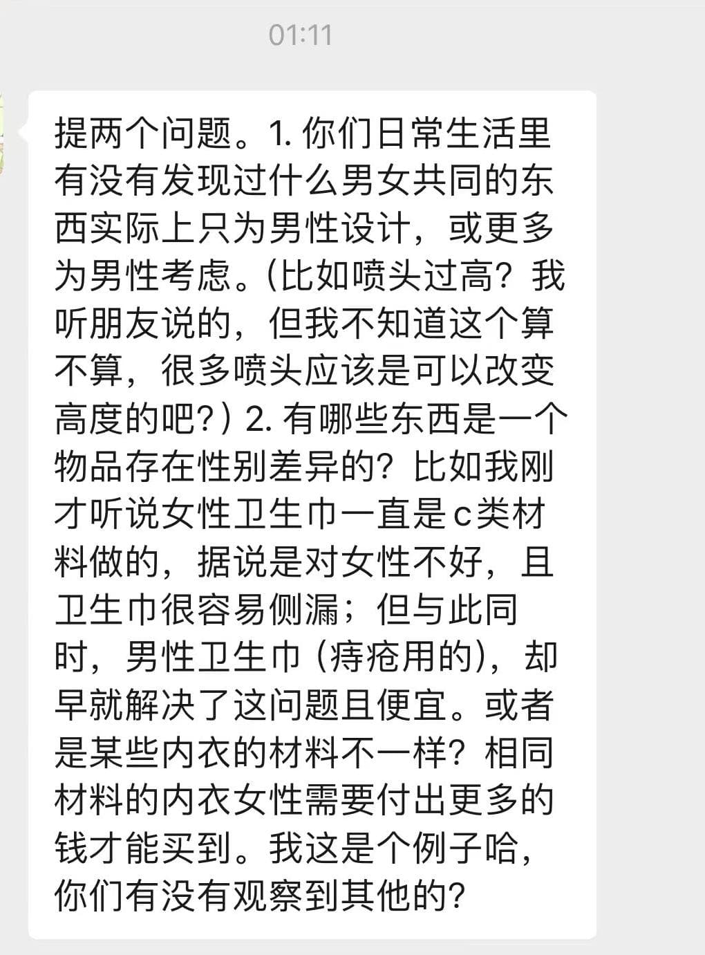 小马关注到了生活中的设计存在对女性的差别对待。能看出,他对性别议题的深入思考确实是建立在大量阅读的基础上的。