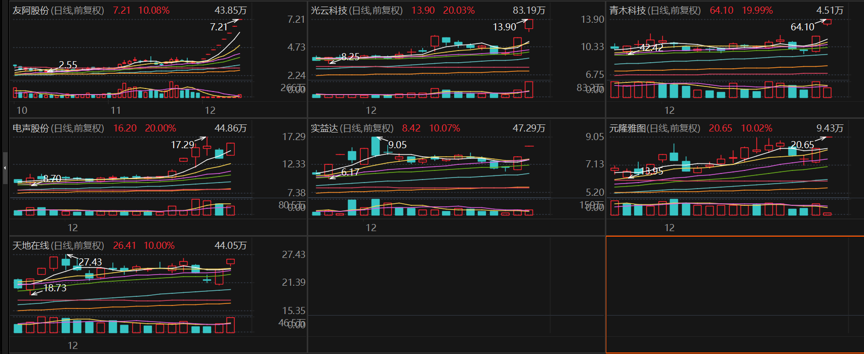 线上拥有“友阿海外购”、“友阿微店”、“友阿购”等购物平台的友阿股份周五收盘斩获八连板成为市场最高标,旗下SaaS产品入驻微盟服务市场的光云科技、通过API对接方式快速实现与品牌的微信商城等打通的青木科技均录得连续两个20CM涨停,启动微信视频号赋能线下经销商等提高提高销量的电声股份20CM涨停,参股企业六度人和是基于腾讯社交网络平台的CRM解决方案提供商的实益达、为腾讯提供整合营销服务的元隆雅图、腾讯广告核心服务商及腾讯企业微信服务商天地在线均录得两连板。