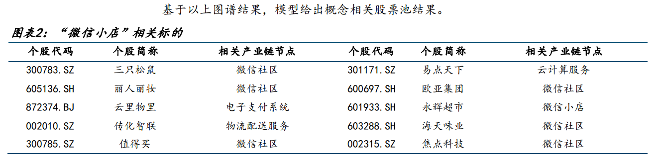 国金证券高智威12月21日研报指出,其使用“产业链 Agent”工具梳理出“微信小店”概念的相关产业链上下游,并整理出“微信小店”概念股名单。建议关注光云科技、三只松鼠、壹网壹创、盐津铺子、青木科技。