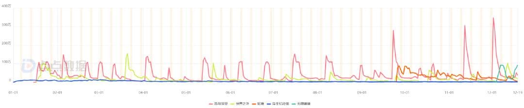 《世界之外》约1631.2万,互动量集中在七月、十月、十一月;主要是七月针对活动文案与某小说相似进行调查;十月、十一月是开启副本、上线主题曲、特别任务等内容,发布大量抽奖。