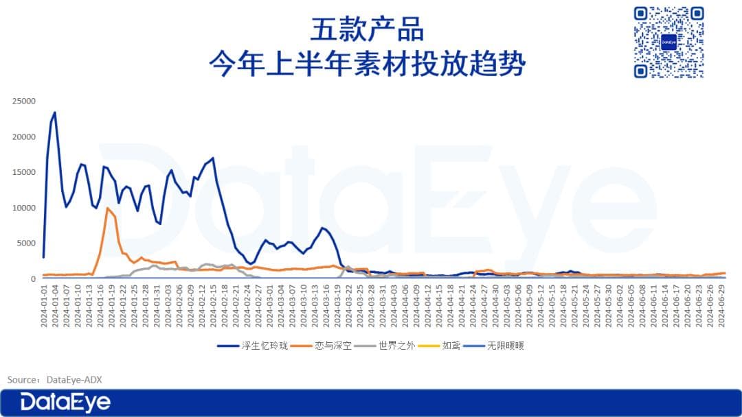 DataEye-ADX数据显示,五款游戏今年以来(截至12月19日)累计投放的去重素材量,分别为《浮生忆玲珑》17万组(视频➕图片)、《恋与深空》10万、《世界之外》4.2万组、《如鸢》5.5万、《无限暖暖》8.7万。