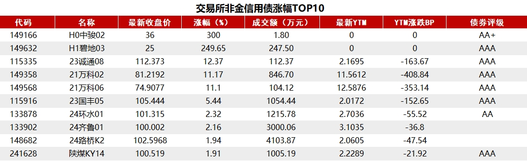 据Choice 数据统计显示,今日交易所市场非金信用债涨幅排行前五的分别是:H0中骏02、H1碧地03、23诚通08、21万科02、21万科06。具体如下: