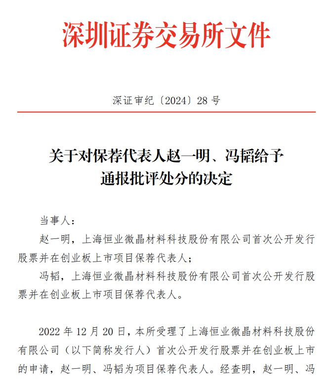 根据上述6项违规情形,公司董事长、总经理戴联平,财务总监褚保章未能保证发行上市申请文件和信息披露的真实、准确、完整。监管认为戴联平对上述违规行为负有责任,褚保章对上述第一、第二、第四及第五项违规行为负有责任。因此,对恒业微晶以及公司董事长、总经理戴联平和财务总监褚保章都给予了通报批评的处分。