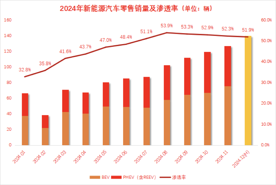 据乘联会最新数据,2024年12月,中国狭义乘用车零售市场预计将达到270万辆,同比增长14.8%,环比增长11.4%。其中,新能源车型零售预计可达140万辆,渗透率约51.9%。依此测算,2024年国内新能源汽车零售销量有望达到1100万辆,同比增长42.2%,且渗透率已连续6个月超过50%。