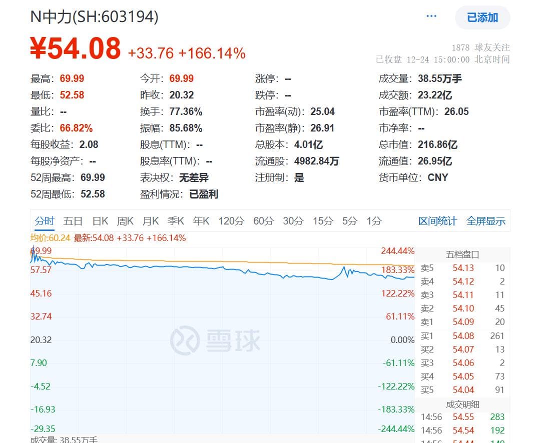上市首日,中力股份开盘价为69.99元/股,高开244%。截至收盘,中力股份报54.08元/股,市值216.86亿元。
