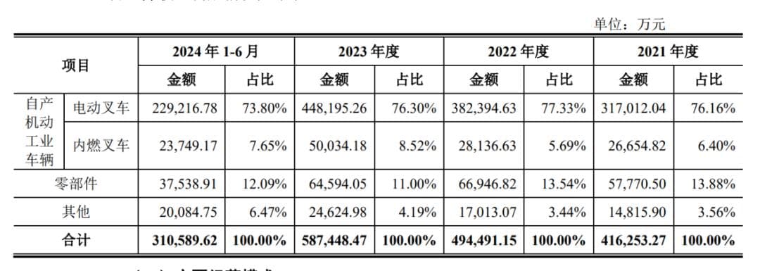 而中力股份的主要收入来自电动叉车。招股书显示,2021年、2022年、2023年及2024年上半年,中力股份电动叉车的收入分别为31.70亿元、38.24亿元、44.82亿元及22.92亿元,收入占比分别为76.16%、77.33%、76.30%及73.80%。同期的电动叉车销量分别为234393台,241593台、248398台、138943台。