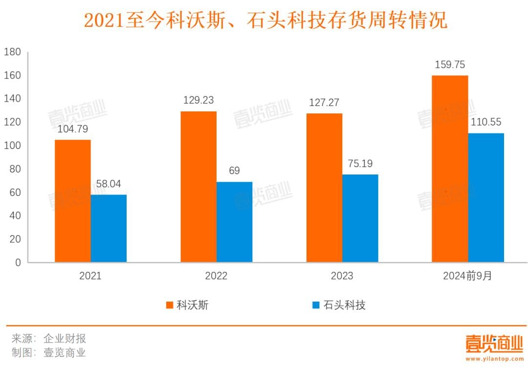 2021年,科沃斯、石头科技的存货周转周期分别为104.79日、58.04日,今年前9月,这一数值分别攀升至159.75、110.55,石头科技的周转周期几乎翻倍。