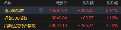 截至收盘,道琼斯指数涨0.91%,录得四连涨,报43,297.03点;标普500指数涨1.10%,报6,040.04点;纳斯达克综合指数涨1.35%,报20,031.13点,时隔三个交易日重回2万关口上方。