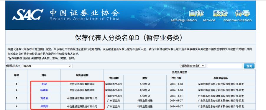 中证协保荐代表人分类名单D(暂停业务类)显示,年内有4名保代被暂停业务,分别是中信证券的胡滨、杨锐彬,以及中信建投的刘能清、邱荣辉。