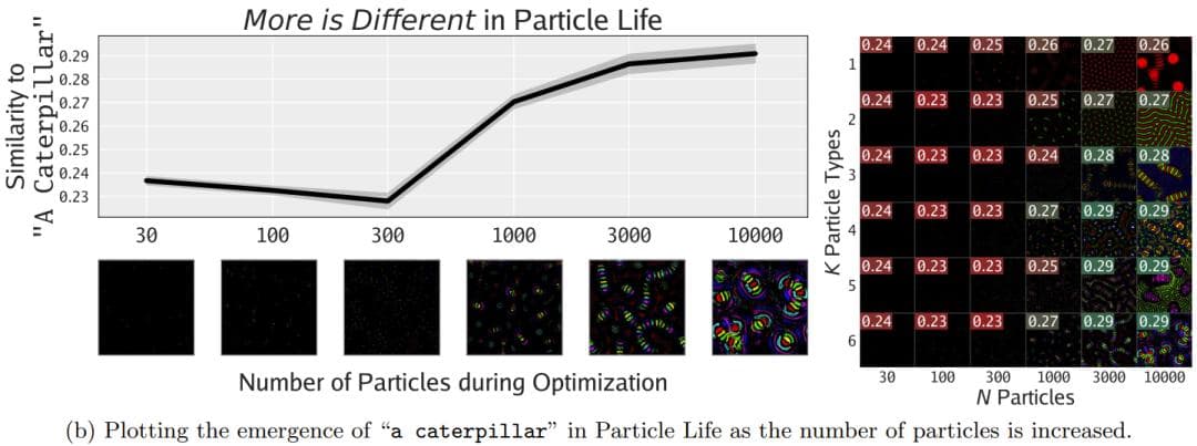 图 7b 则评估了粒子生命中粒子数量对其表示某些生命形式的能力的影响。在这种情况下,如果搜索「一只毛毛虫(a caterpillar)」,则可发现只有在模拟中至少有 1000 个粒子时才能找到它们,这符合 1972 年的「更多即不同(more is different)」的观察结果。