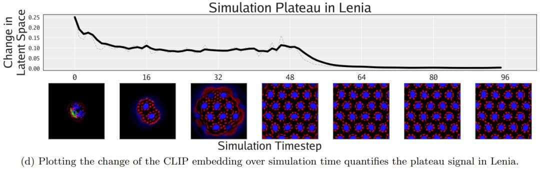 图 7d 给出了对于 Lenia 模拟,CLIP 向量随模拟时间的变化速度。当模拟定性地看起来已成静态时,该指标恰好稳定,因此这可提供有用的模拟停止条件。
