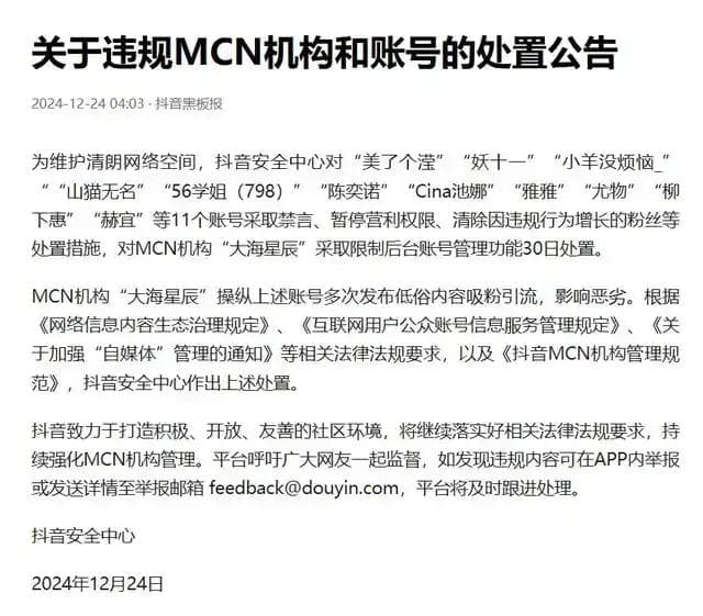 抖音安全中心宣布,为维护清朗网络空间,对“56学姐(798)”等11个账号采取禁言、暂停营利权限、清除因违规行为增长的粉丝等处置措施,对MCN机构“大海星辰”采取限制后台账号管理功能30日处置。
