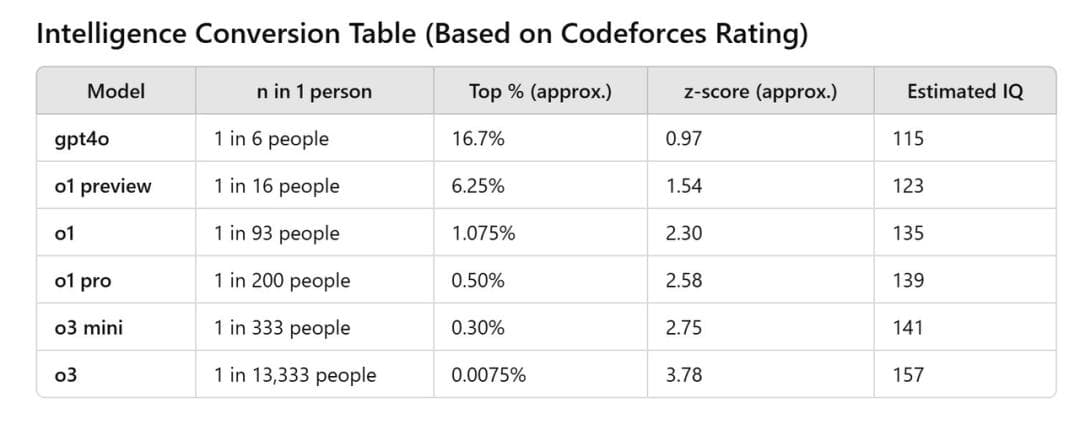 根据外网疯传的一张图表,OpenAI 新模型 o3 在 Codeforces 上的评分为 2727,转换成人类智商的分数也就相当于 157,妥妥万里挑一。