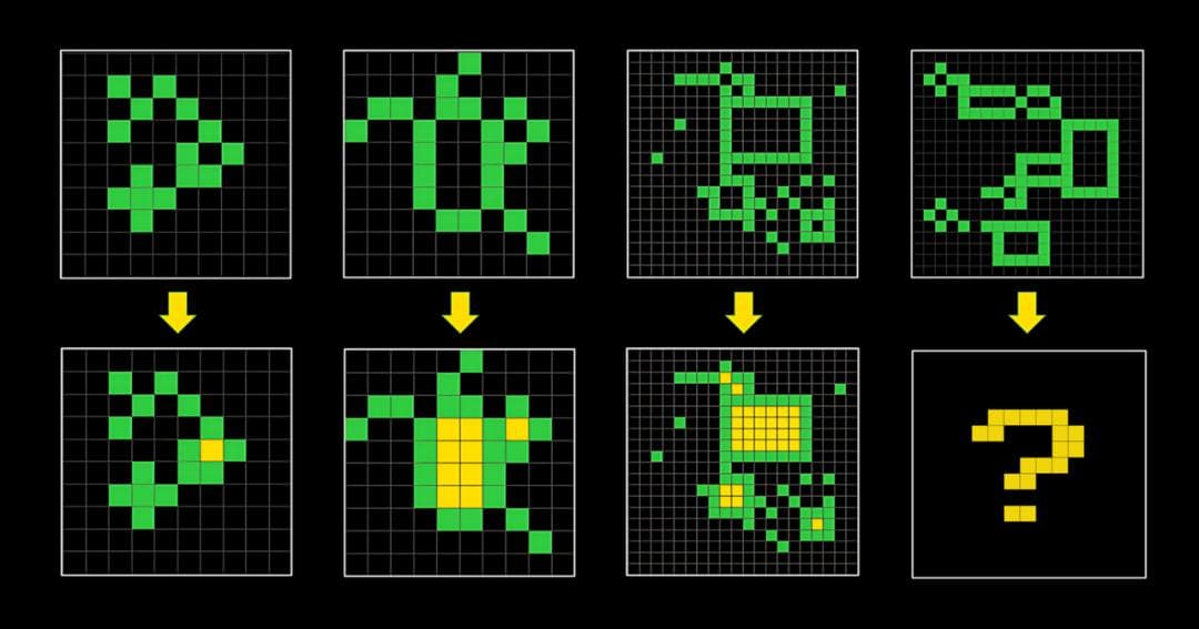 对人类来说容易,但对 AI 来说非常困难。ARC-AGI 包含一系列抽象视觉推理任务,每个任务提供几个输入和对应的输出网格,受测者需要根据这些范例推断出规则,并产生正确的网格输出。