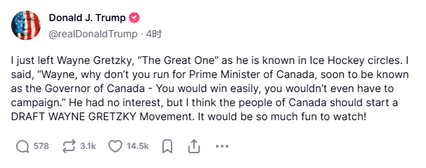 他写道:“我刚刚与韦恩·格雷茨基分开,他在冰球圈被称为‘伟大的人’。我说,‘韦恩,你为什么不竞选加拿大总理,很快就会被称为加拿大总理——你会轻松获胜,你甚至不需要竞选’。”