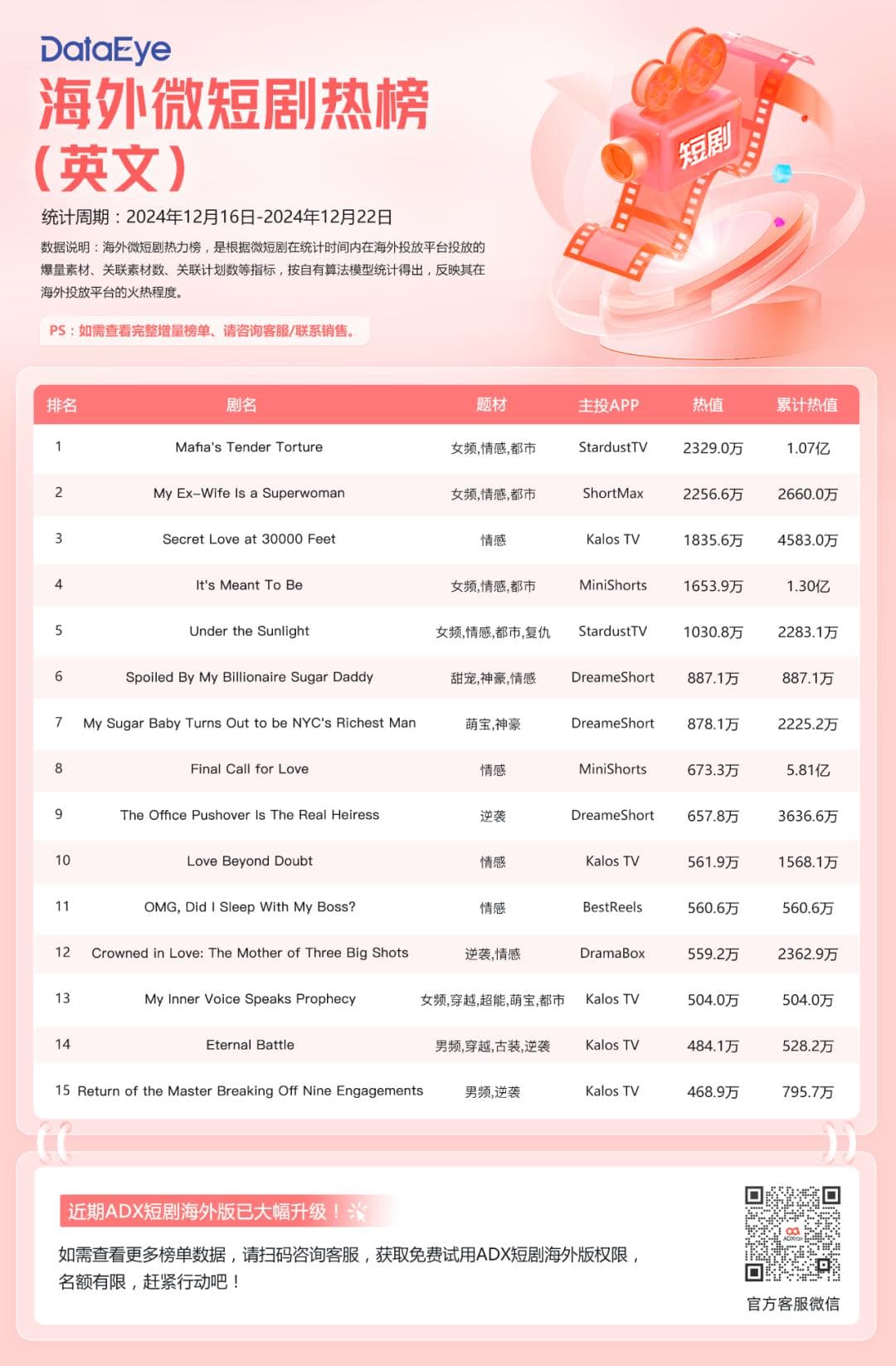 本期(12月16日-12月22日)DataEye海外英文短剧热榜,《Mafia's Tender Torture》登顶;《My Ex-Wife Is a Superwoman》第二;《Secret Love at 30000 Feet》位列第三。