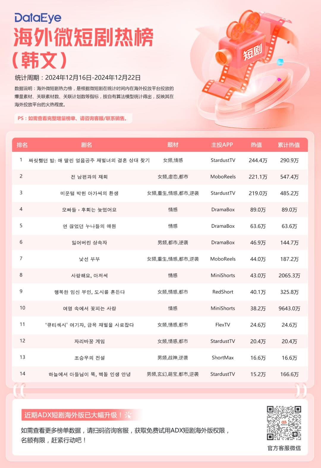 透过一周(12月16日-12月22日)海外数据,DataEye短剧观察发现了以下几个主要趋势和结论: