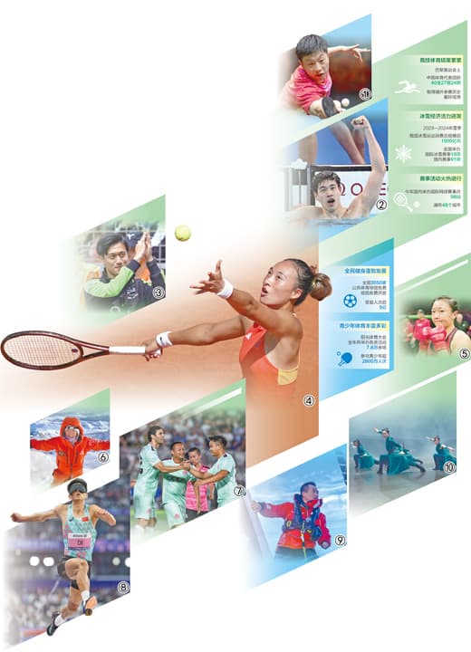 图④:2024年,郑钦文表现出色。年初,她打进澳网女单决赛并获亚军。巴黎奥运会上,她连胜强手,成为亚洲首位获得奥运网球单打金牌的选手。在WTA(国际女子职业网联)年终总决赛中,她获得亚军,以年终世界排名第五的成绩结束本赛季。图为郑钦文在巴黎奥运会女单1/4决赛中。