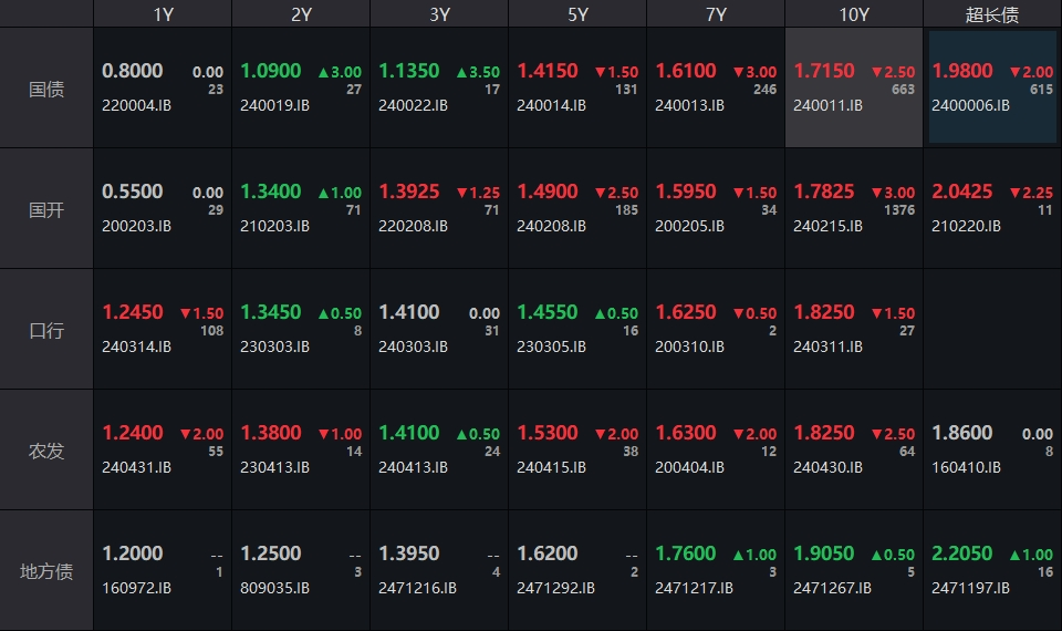 银行间主要利率债收益率长短端分化。截止北京时间16:30,10年期国债活跃券240011收益率下行2.5bp报1.715%,30年期国债活跃券2400006收益率下行2bp报1.98%,10年期国开活跃券240215收益率下行3bp报1.7825%。
