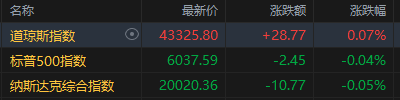 截至收盘,道琼斯指数涨0.07%,录得五连涨,报43,325.80点;标普500指数跌0.04%,报6,037.59点;纳斯达克综合指数跌0.05%,报20,020.36点,双双结束三连涨。