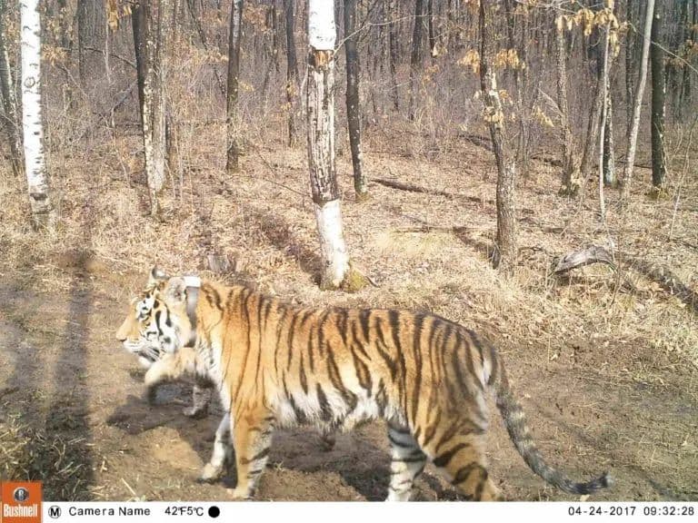 2017年,摄像头抓拍到斯维特拉娅,它身后有一只被挡住的小老虎。随着保护意识增加,它的孩子不会像以前那样轻易成为孤儿|图源:PROO Tiger Center