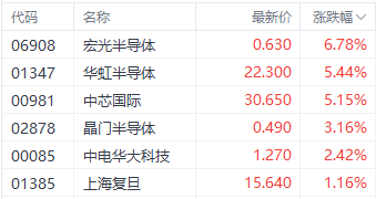 半导体股中,华虹半导体(01347.HK)、中芯国际(00981.HK)、上海复旦(01385.HK)分别上涨5.44%、5.15%、1.16%。