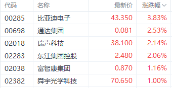 消费电子股中,比亚迪电子(00285.HK)、瑞声科技(02018.HK)、富智康集团(02038.HK)分别上涨 3.83%、2.14%、1.16%。