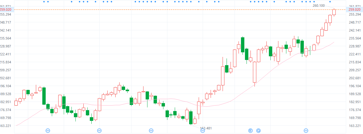 消息方面,苹果连续第四个交易日续创历史新高,总市值达3.92万亿美元。截至收盘,涨0.32%,报收259.02美元。