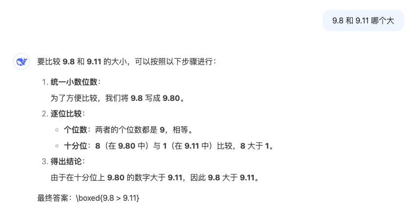 不过, DeepSeek-V3 并不支持多模态输入输出,估计还得再耐心等待。 而 体验下来, 「 9.8 和 9.11 哪个大 」和 「 strawberry 里有多少个 r 」已经难不倒它了。