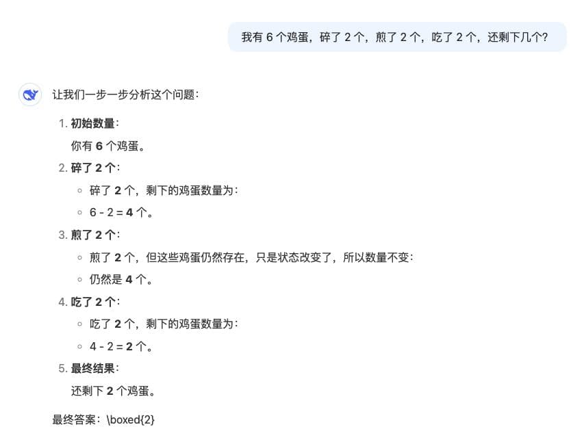 「 我有 6 个鸡蛋,碎了 2 个,煎了 2 个,吃了 2 个,还剩下几个? 」